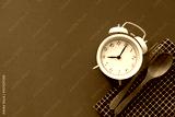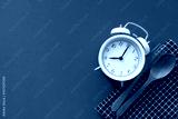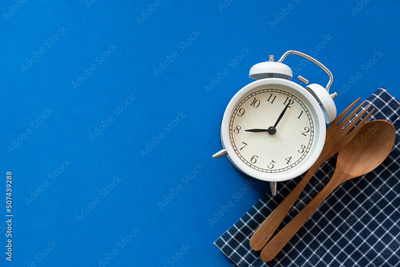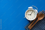 Food clock. Healthy food concept on blue table background, time for eat food concept