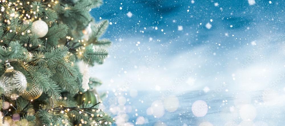 banner. blue christmas decoration, postcard. on the tree a snowflake, balls and a garland