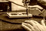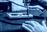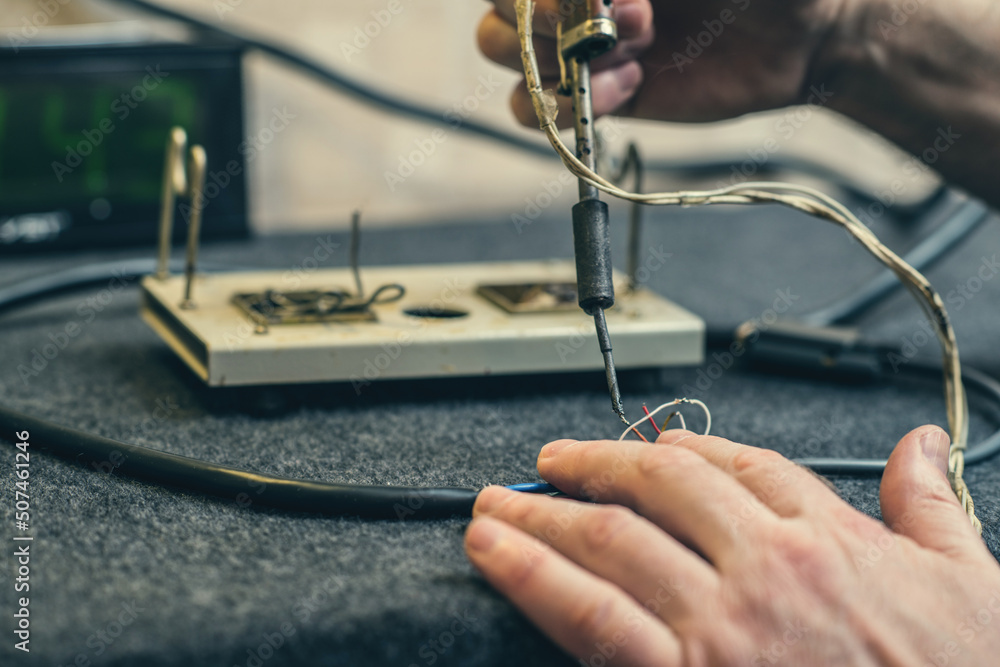 Close - up of male hand with wires and retro soldering iron. Soldering process at home