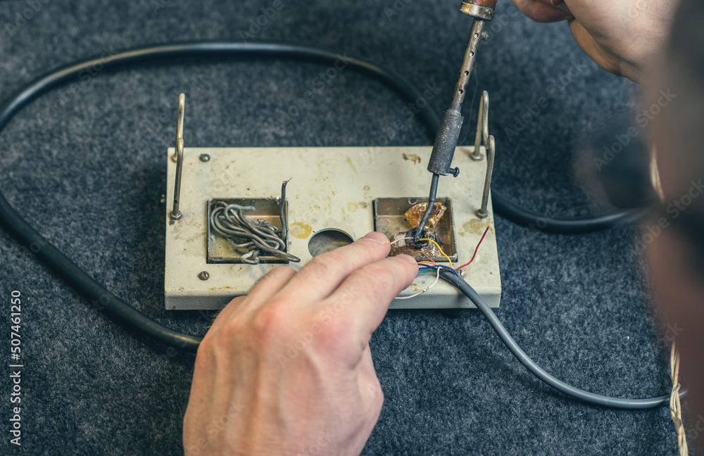 Close - up of male hand with wires and retro soldering iron. Soldering process at home