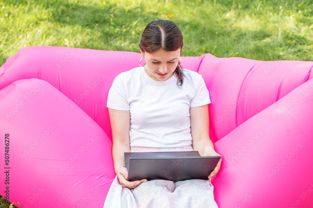 Adult woman working or studying remotely using laptop and internet. Summer. Pink bean bag chair.
