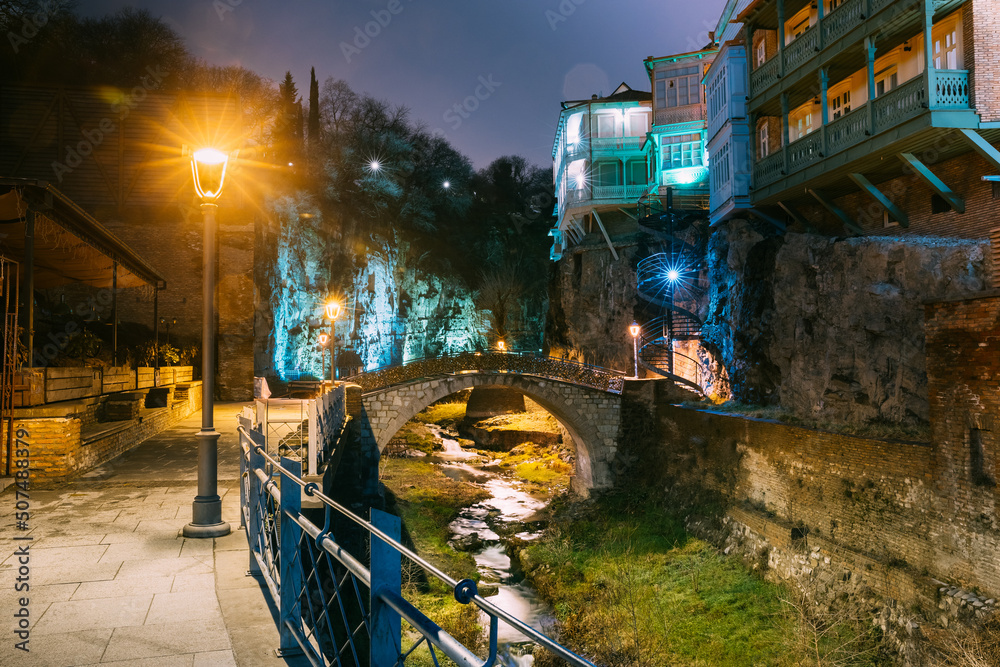 Tbilisi, Georgia, Night Scenic View Of Bridge of Love in Bath District - Is The Ancient District Of Tbilisi, Georgia. Hanging houses above rvier in canyon.