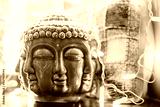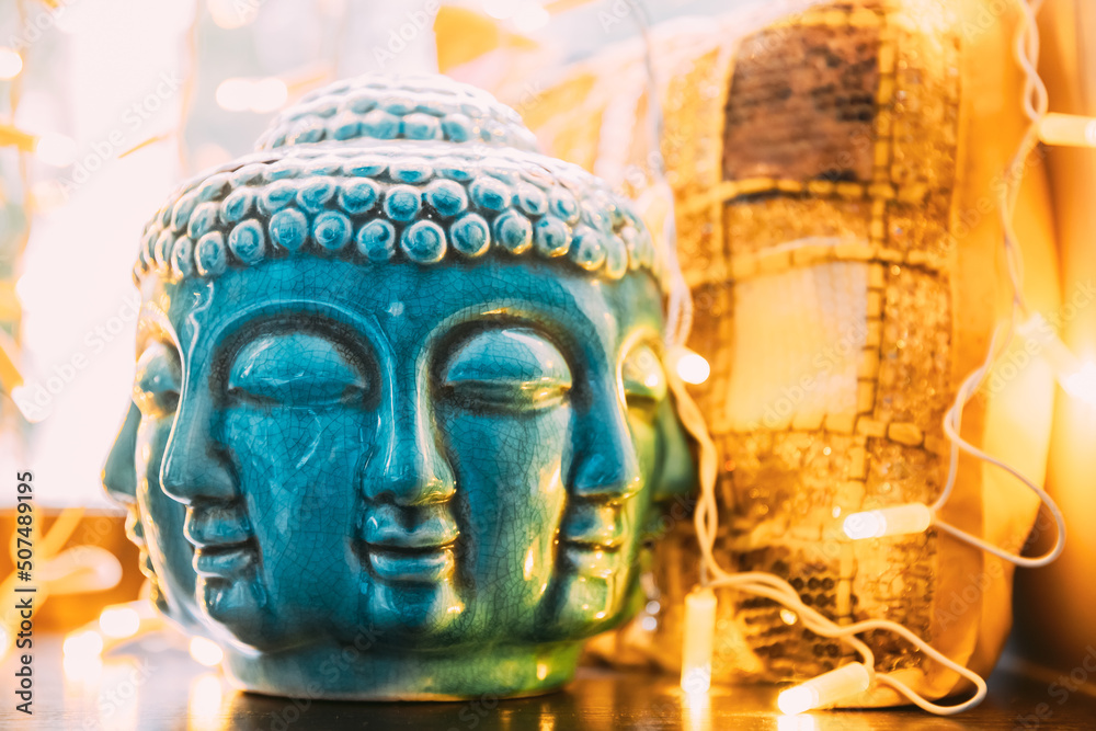 Blue statue of Buddha head lighted by bokeh boke lights. Interior element.