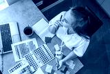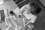 Woman sits at table in modern office next to color palette and fabric samples for design project.