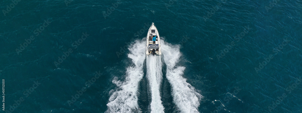 Aerial drone ultra wide photo of luxury rigid inflatable speed boat cruising in high speed in Aegean deep blue sea, Greece