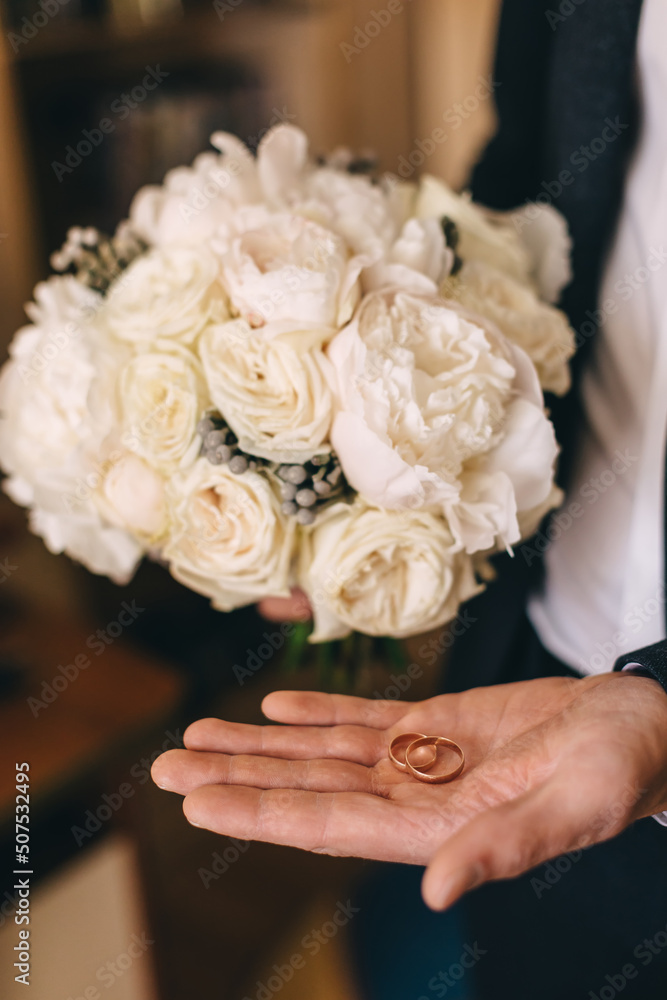 the groom's hands hold the bride's wedding bouquet of white flowers and wedding rings before the ceremony.