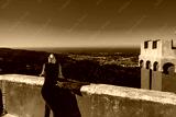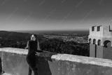A young carefree woman in a dress and sunglasses stands on a balcony with a beautiful view from the Pane Palace in Sintra, Portugal