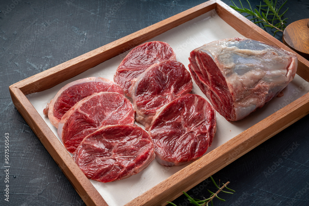 Fresh Silver shank meat in wooden plate on wooden background, Shank beef first grade in wooden plate on wooden background.