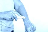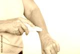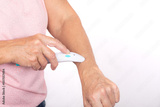 A woman treats a mosquito bite on her arm with an electric bite healer - isolated on white background.