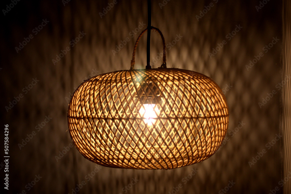 Light of modern hanging wooden lamp, hanging on the ceiling in the bedroom at night. Lamp shade. Light and shadow.