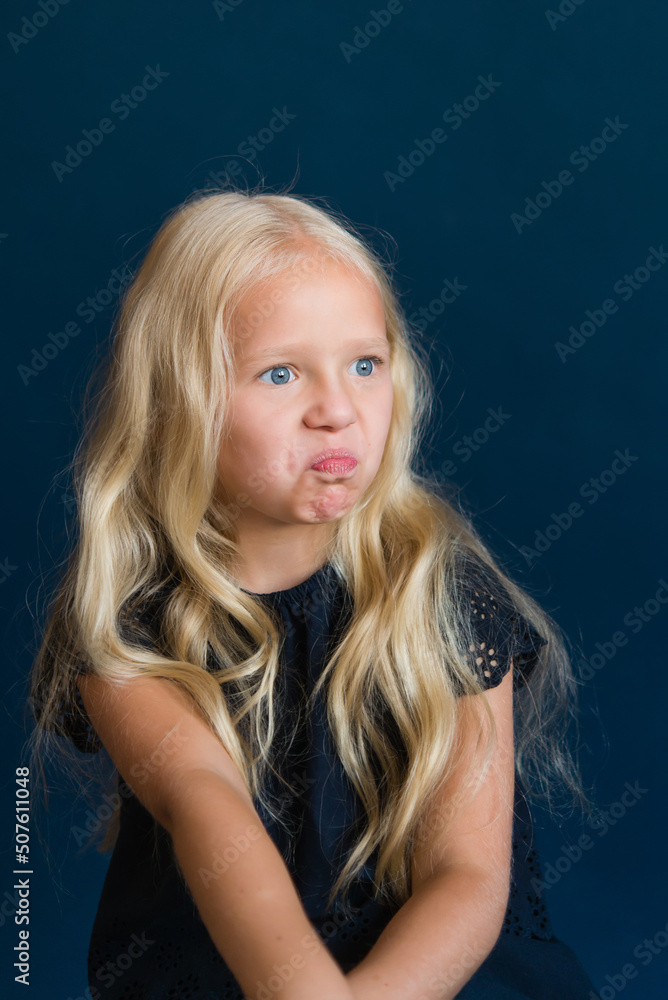 cute girl with long blond hair in a dark dress. studio shot on dark background