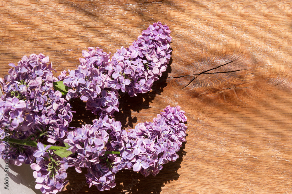spring soft purple lilac flowers on wood background, natural seasonal floral background.