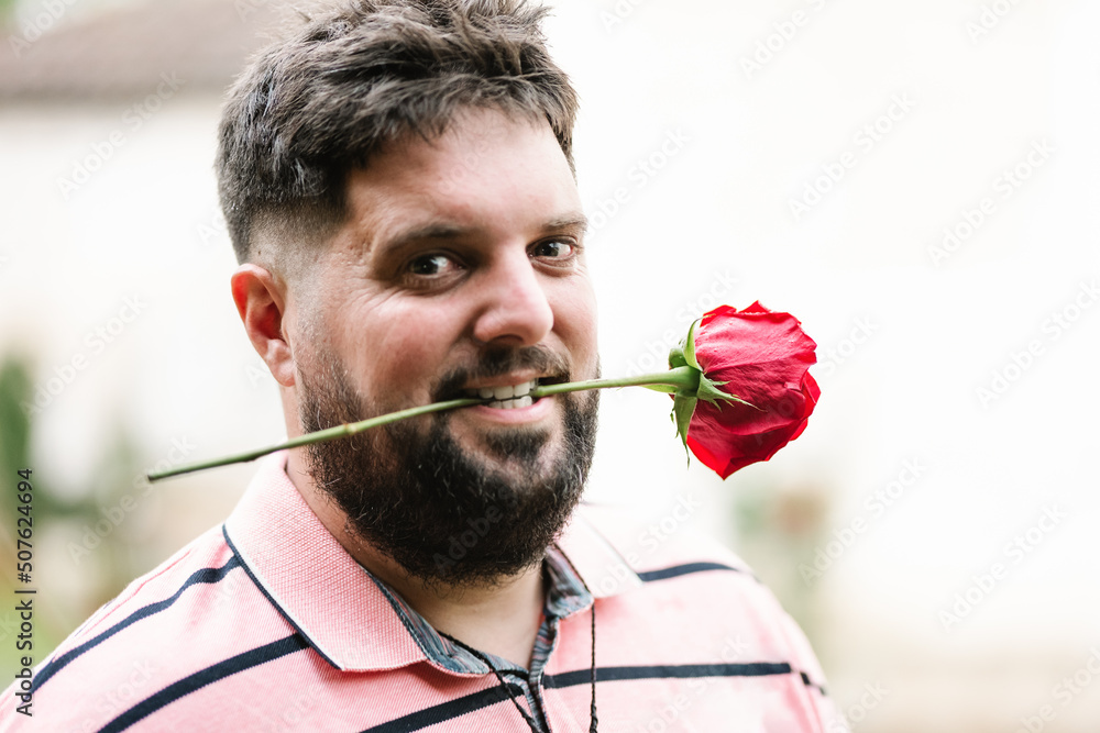 man holding a beautiful red rose in his mouth with teeth on a valentines day or birthday