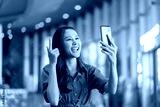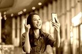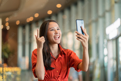 happiness asian female woman smile hand wave give a kiss to family via video call smartphone device social distancing greeting with blur mall background new normal lifestyle
