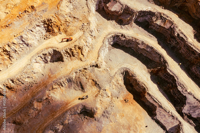 Industrial terraces in a mining quarry. Aerial view of open pit mining. Excavation of the Dolomite Mine. Extractive industry.