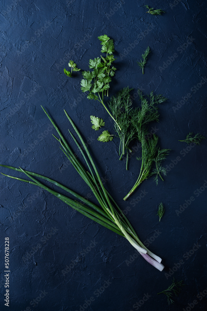 Fresh parsley, dill, green onion on dark background. Organic local food