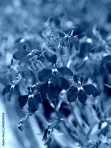 Edging lobelia or Lobelia erinus. Loose panicles of flowers with dark blue fused sepals, trilobed fan-shaped lower lips, yellow and white center and small stamens