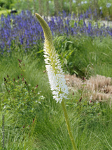 Eremurus himalaicus - Foxtail lily or desert candle with bottlebrush-shaped ivory to white pure flowers and prominent yellow stamens open in spike on high stems