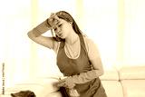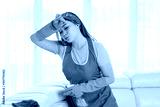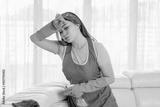 Tired young woman cleaning a sofa at home