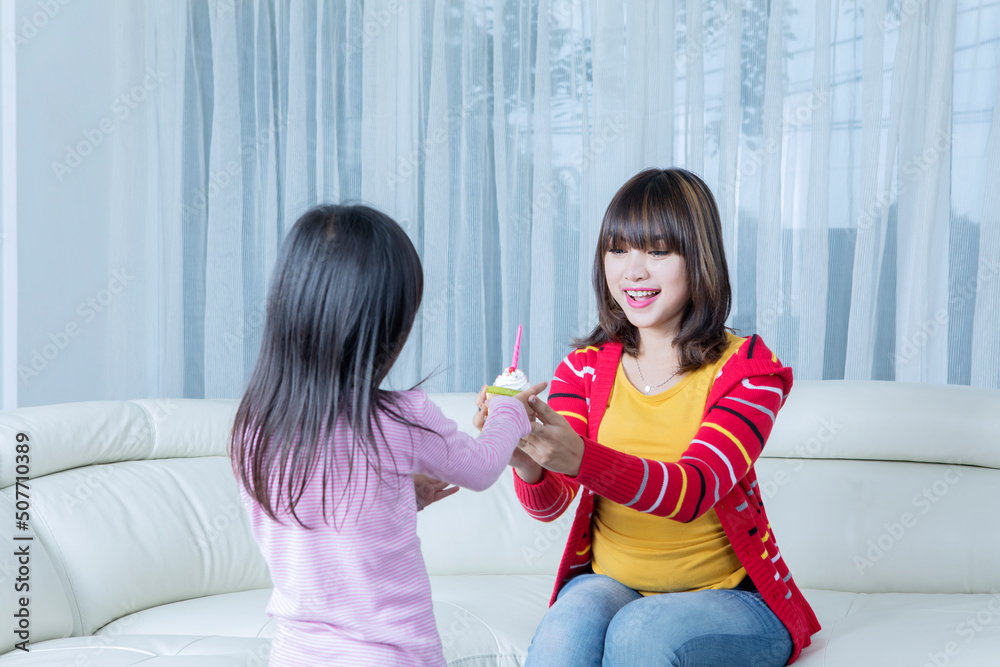 Young mother get a cupcake from daughter at home
