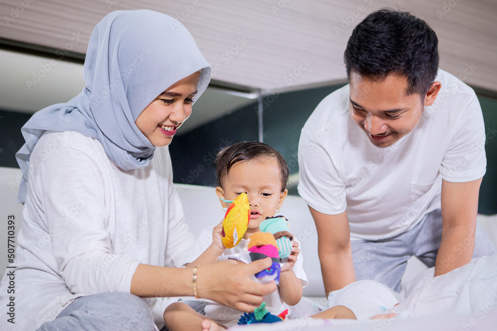 Baby girl playing with her parents on the bed