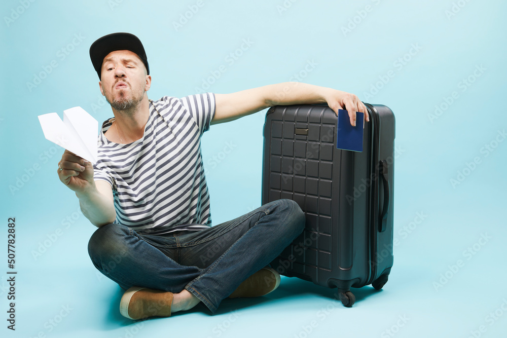 portrait of man with travel suitcase and paper airplane, isolated on blue . Concept of traveling funny and happy emotion tourist.