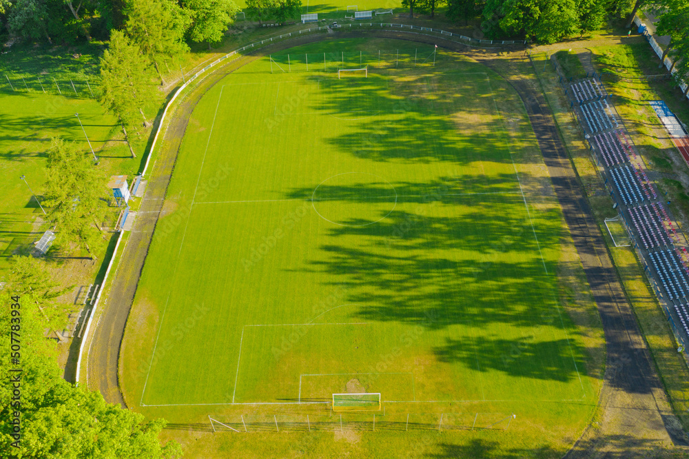 Prowincjonalny stadion. W centrum porośnięte murawą boisko piłkarskie, wokół bieżnia i niewielka trybuna dla kibiców. Widok z drona.