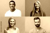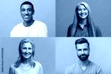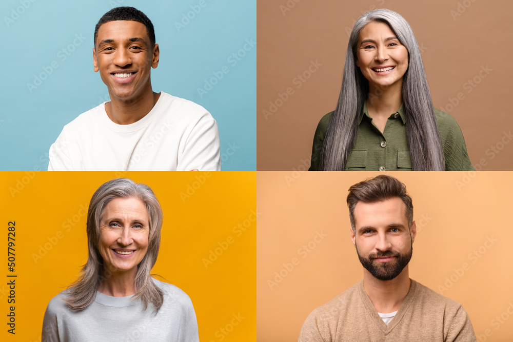 Collage of four different people in casual wear looking at camera, several diverse people involved virtual meeting