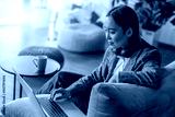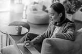 Attractive asian business woman working laptop sitting in cozy cafe. High quality photo