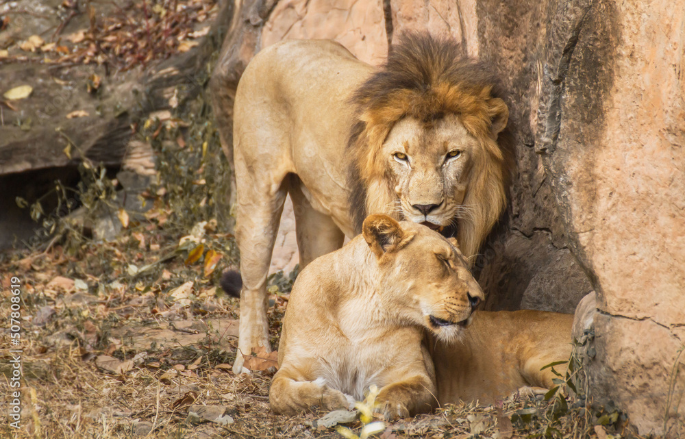 Pair of adult Lions in zoological garden. Portrait of South African lion (Panthera leo krugeri) Lions that want to hurt people because they fear that people will hurt their own family.