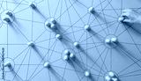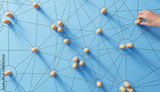 Social media networking. Network with members connected with each other. Group of people. Communication, teamwork, community, society. Abstract concept with wooden pieces on blue background.