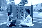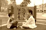 Adorable Asian little boy and young girl kid sitting in the garden playground with playing rock scissors paper game.