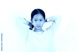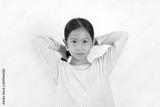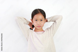 Cute Asian young girl child tie her hair and looking at camera on white background. Child Care concept.