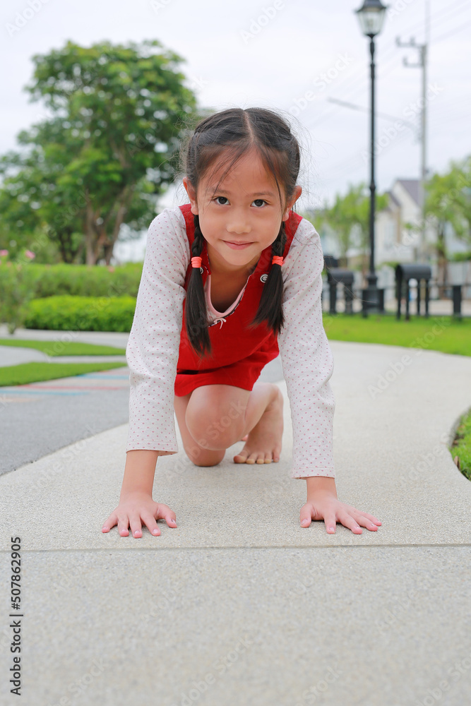 Asian young girl child preparing to run in the garden. Kid prepare for start.