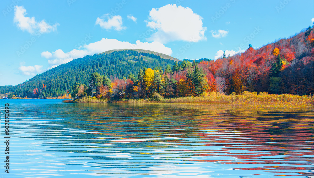 Abant Lake - Autumn forest landscape reflection on the water with wooden pier - Abant National Park - Bolu, Turkey