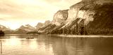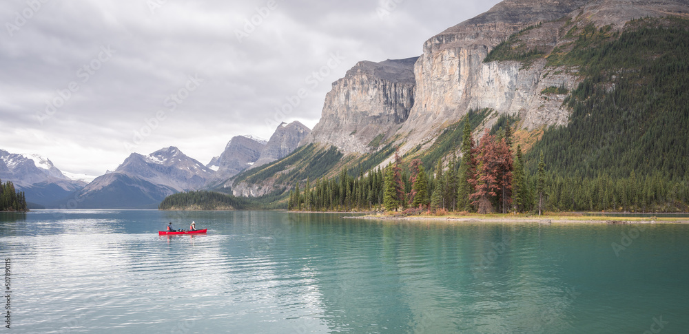 Kayaking on a turquoise alpine lake surrounded by mountains, Jasper National Park, Canada