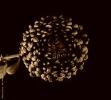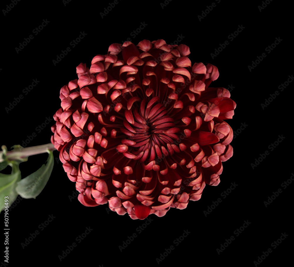 Red color chrysanthemums flower on black wall background. Minimalist still life.