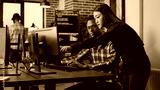 Two programers holding laptop with coding interface walking towards desk and sitting down talking about online cloud computing. Software developers team discussing algorithms on computer screen.