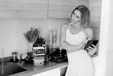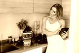 A slender blogger girl looks through a photo taken on her phone for her blog about healthy eating and. The concept of a healthy diet and a healthy lifestyle