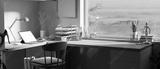 Modern home office workspace with tablet mockup on wooden corner tabletop near the window.