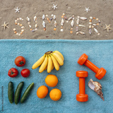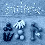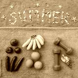 Fruits, vegetables and dumbbells on blue towel on beach sand beside word Summer made of seashells