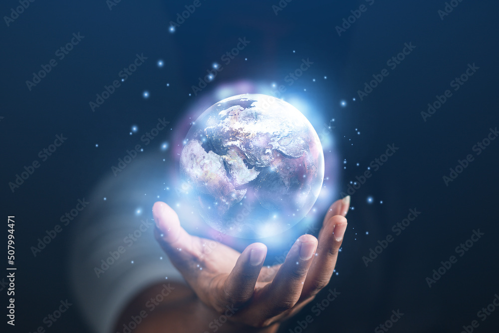 concept of future world technology By the earth in the hands of man. Earth day. Energy saving concept. Elements of this image furnished by NASA.