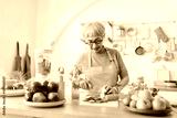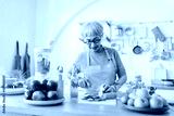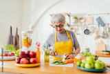 Mature smiling tattoo woman eating salad, fruits and vegetables. Attractive mature woman with fresh green fruit salad at home. Senior woman apron standing in the kitchen counter relaxing in house