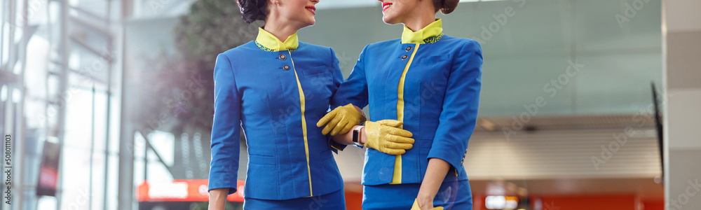 Two cheerful women stewardesses in aviation air hostess uniform looking at each other and smiling while holding travel bags