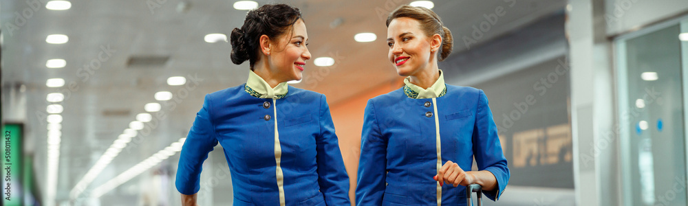 Joyful female flight attendants in air hostess uniform looking at each other and smiling while waiting for airplane