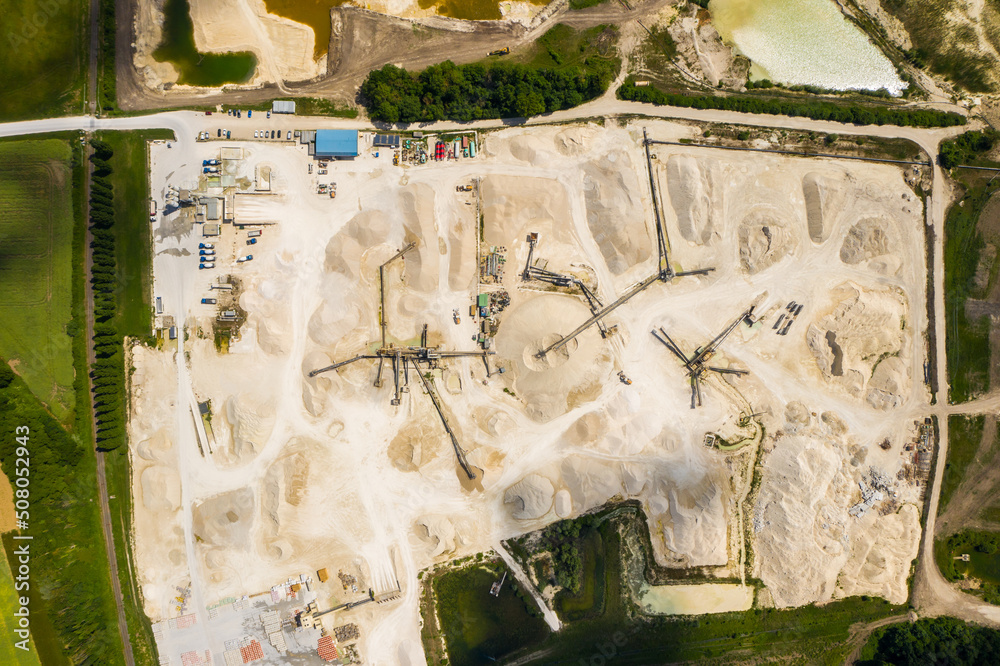 Aerial view of sandpit and factory plant producing sand materials for construction industry. Aerial view of the granite - gravel pit. Equipment for processing and crushing stones.