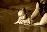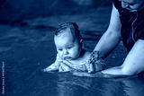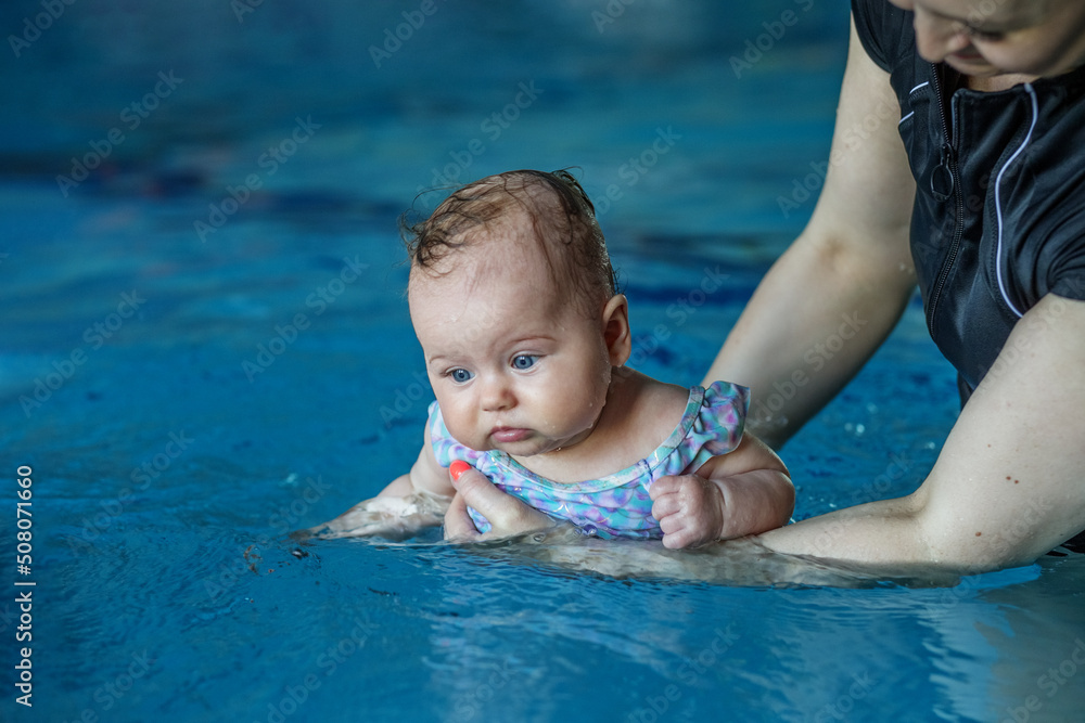 Mom supports baby with hands in swimming pool, teaches to swim and dive.
