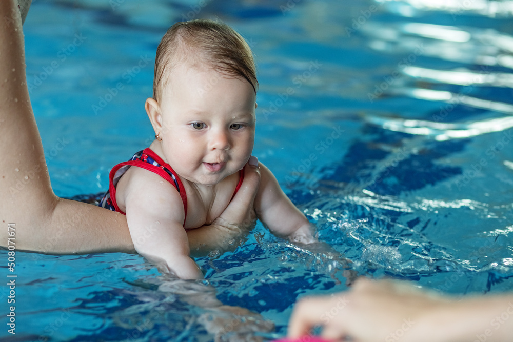 Mom supports baby with hands in swimming pool, teaches to swim and dive.