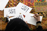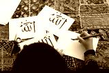 close up muslim girl hands writing Arabic text with bamboo pens and black ink on paper, Arabic letters mean the name of Muslim god "Allah"