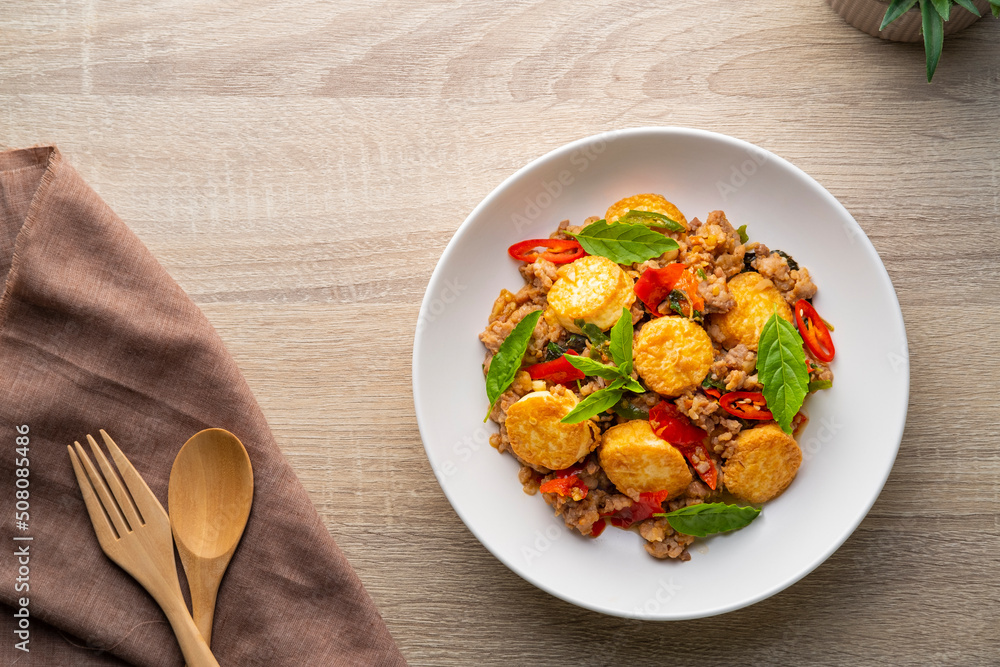 Stir fried basil with minced pork and eggs bean curd in white plate.Top view